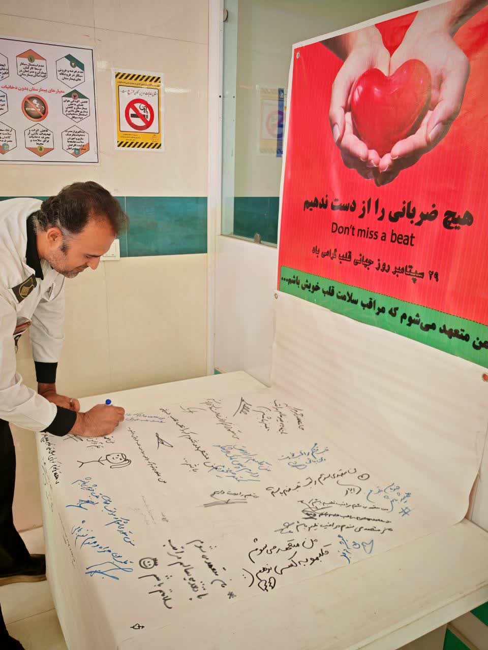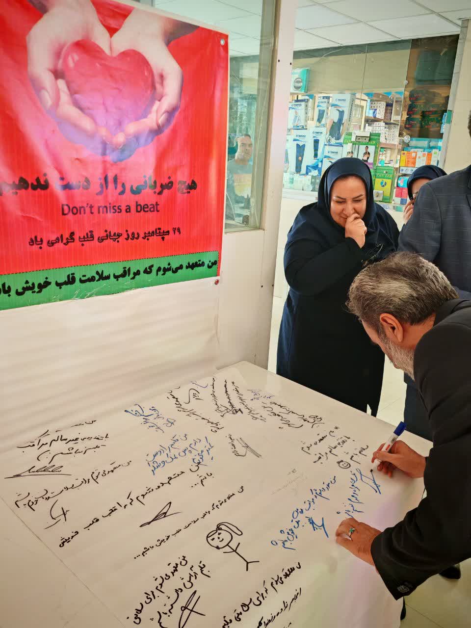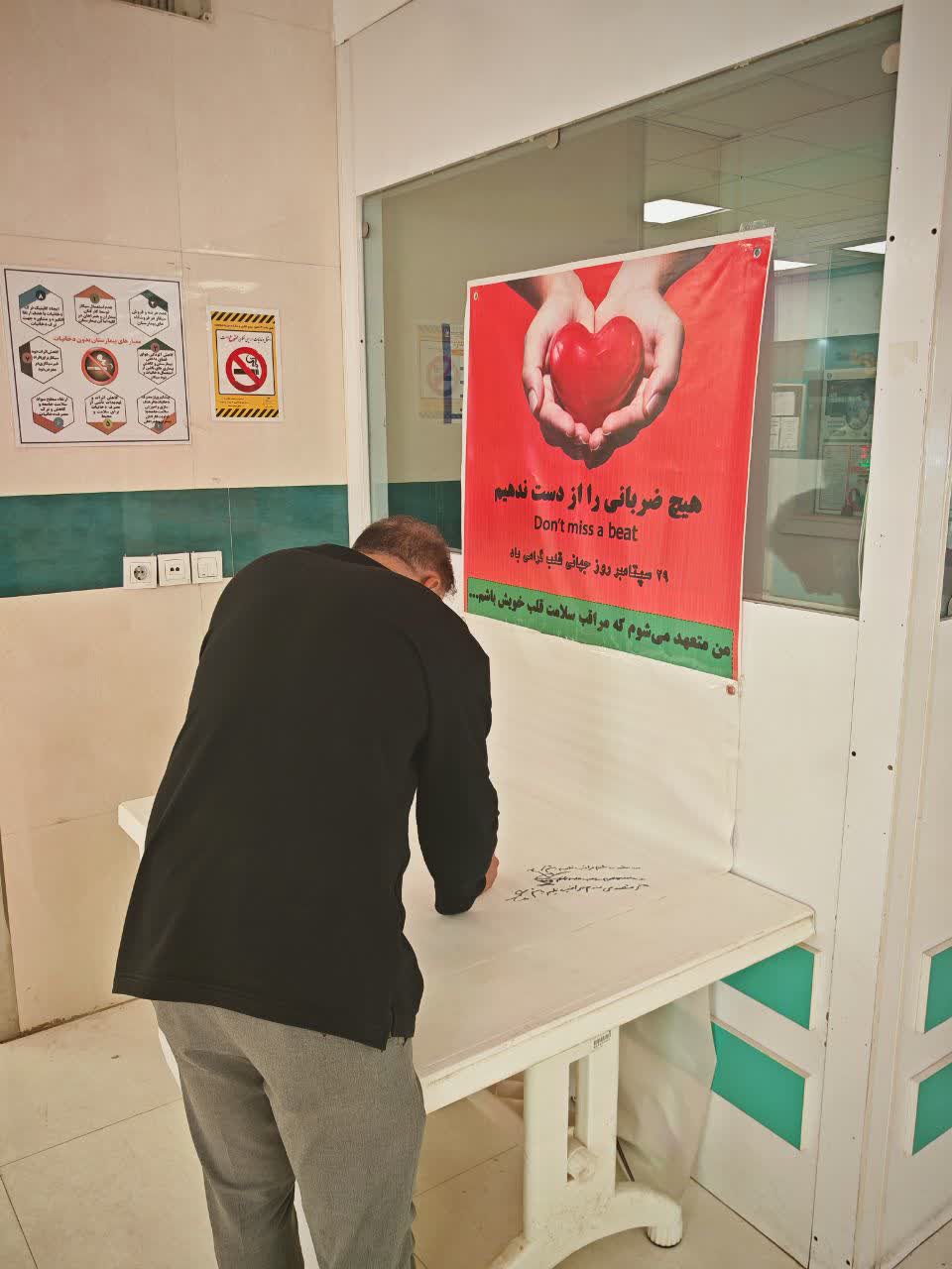 در این برنامه، بنری با شعار «من متعهد میشوم که مراقب سلامت قلب خویش باشم» نصب گردید و کارکنان و مراجعان با نوشتن این جمله و امضای شخصی خود، تعهد و همراهی خویش را در مسیر حفظ سلامت قلب اعلام کردند.