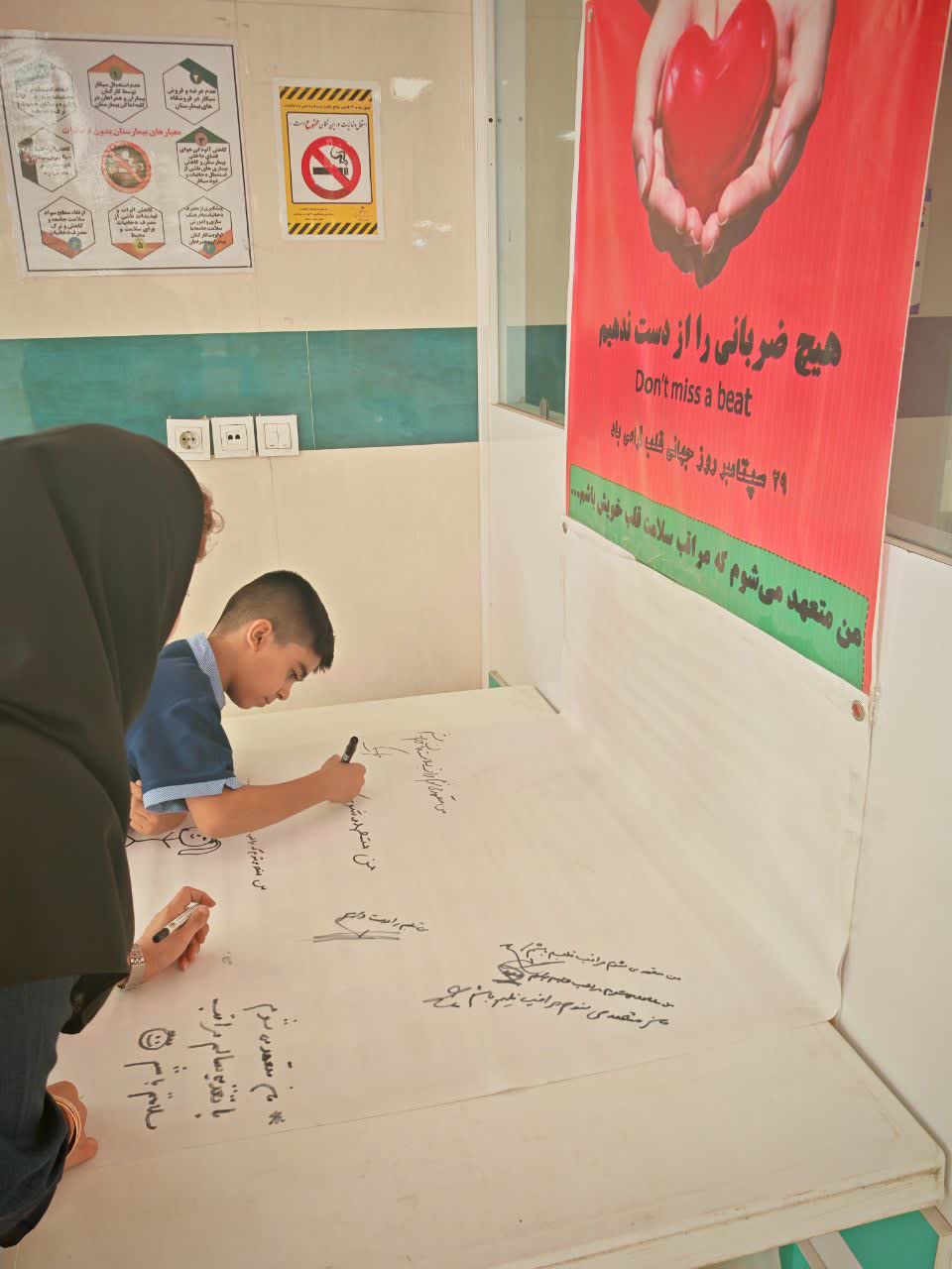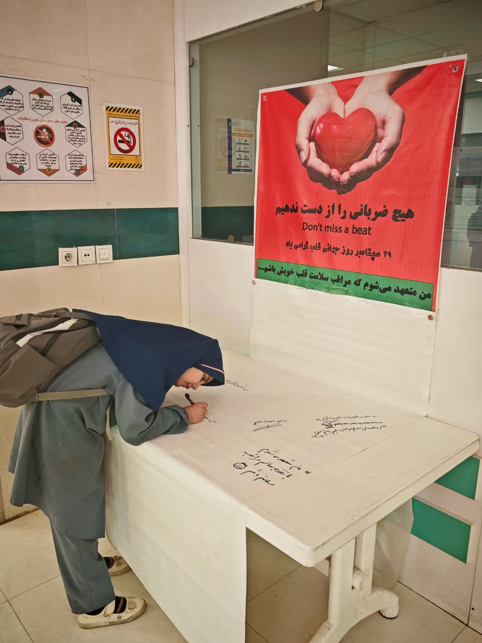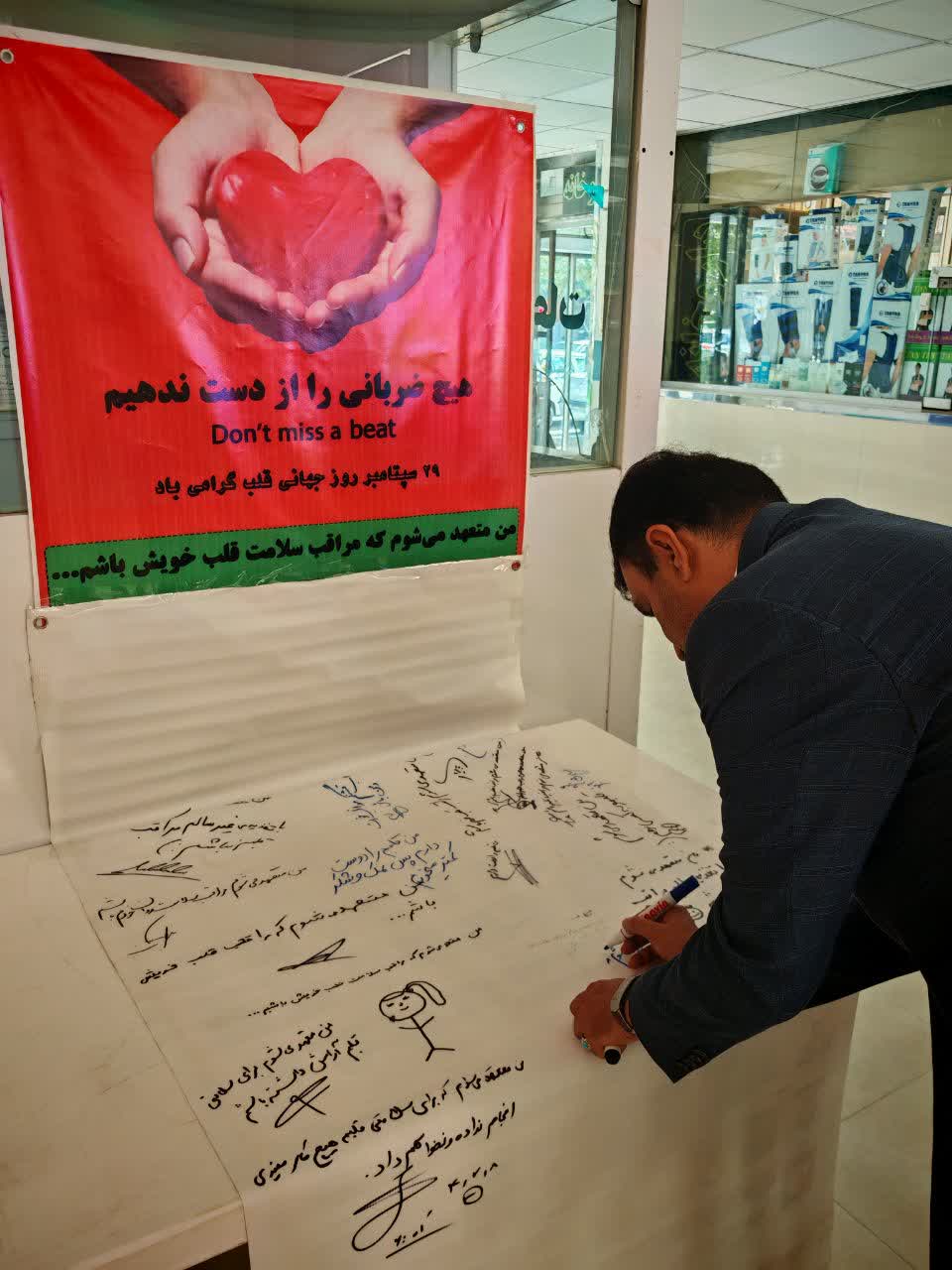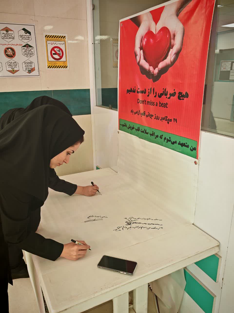 در این برنامه، بنری با شعار «من متعهد میشوم که مراقب سلامت قلب خویش باشم» نصب گردید و کارکنان و مراجعان با نوشتن این جمله و امضای شخصی خود، تعهد و همراهی خویش را در مسیر حفظ سلامت قلب اعلام کردند.