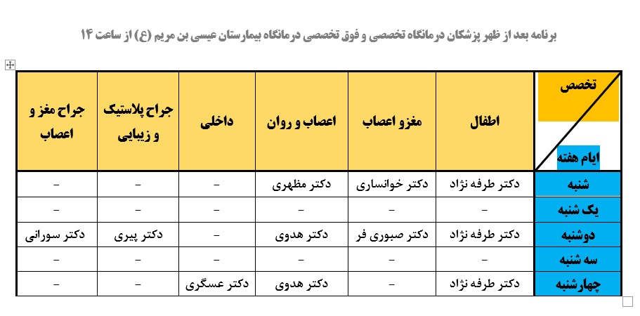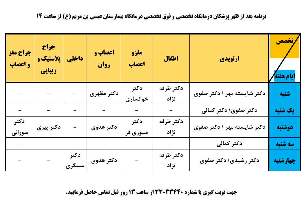 برنامه عصر حضور پزشکان در درمانگاه تخصصی